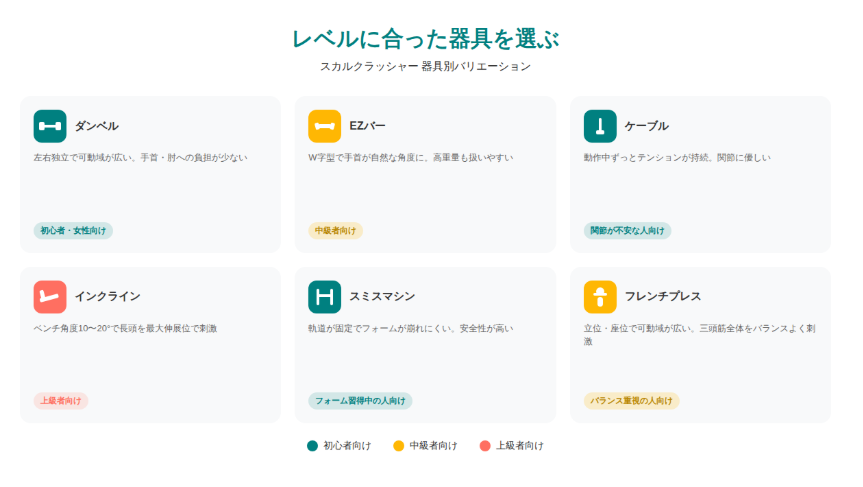 スカルクラッシャーは、使用する器具によってさまざまなバリエーションがあります。それぞれに特徴があり、トレーニングの目的や経験レベルに応じて選ぶことが可能です。