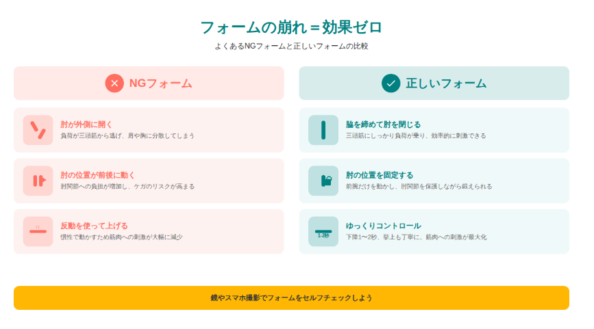 典型的なフォームミスは、肘が開いてしまうこと、肘の位置が動いてしまうこと、反動を使っていること、可動域が狭いことです。鏡を見ながら動作を確認したり、スマホで動画を撮影して自分のフォームをチェックすることをおすすめします。