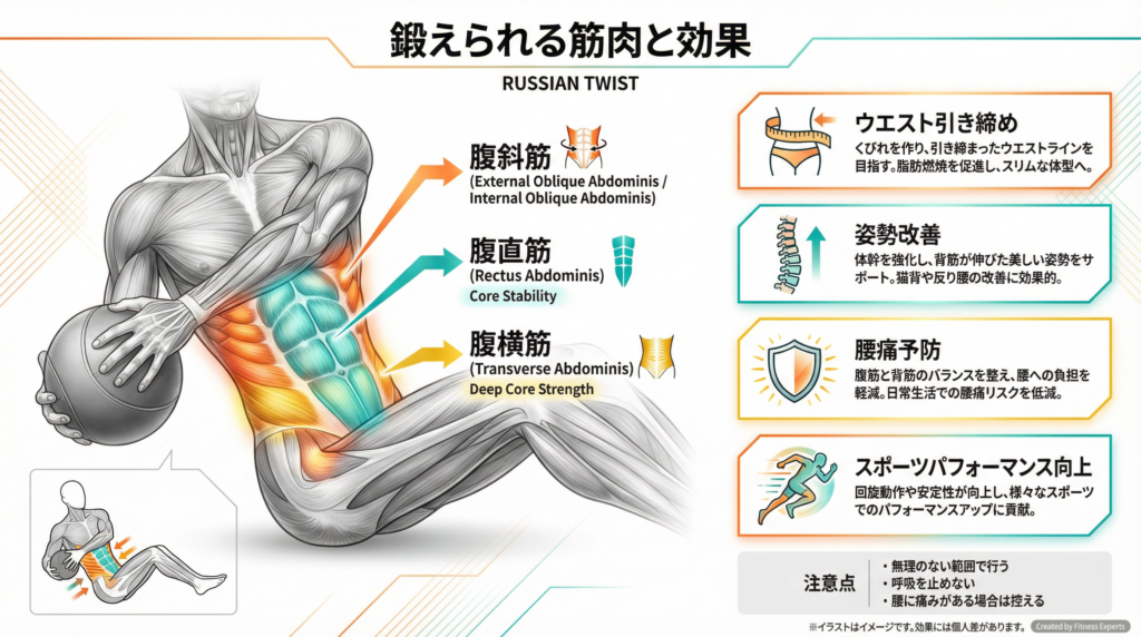 ロシアンツイストがどの筋肉に効くのか、そしてどんな効果が期待できるのかを具体的に見ていきましょう。