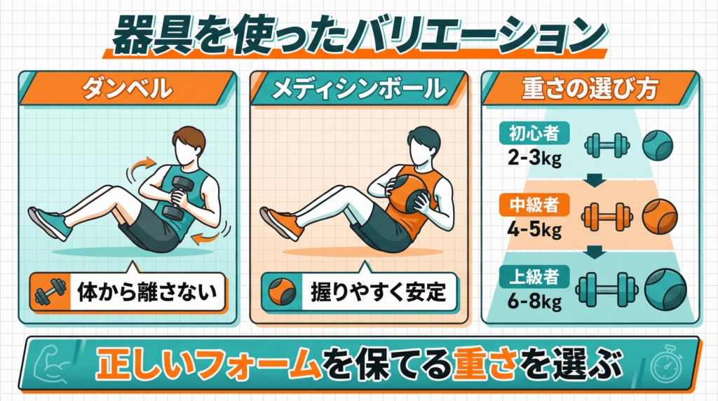 器具なしの自重トレーニングとして始められますが、慣れてきたらダンベルやメディシンボールを持って行うことで、さらに負荷を高めることも可能。