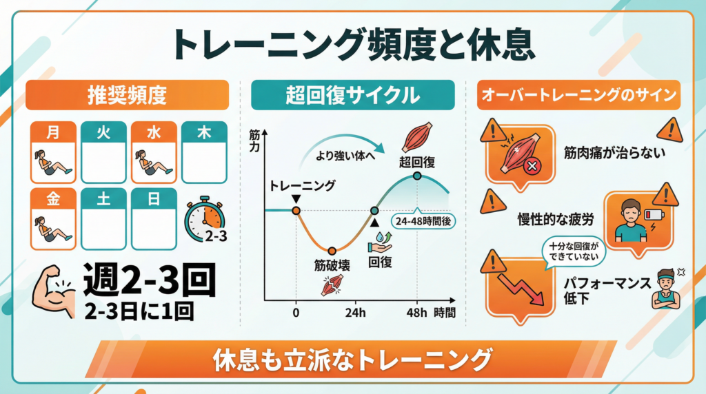 この頻度であれば、筋肉が十分に回復する時間を確保しながら、継続的に刺激を与え続けることができます。