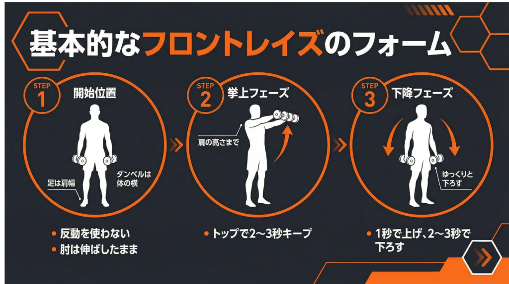 フロントレイズは、正しいフォームで行わないと効果が出にくい種目です。