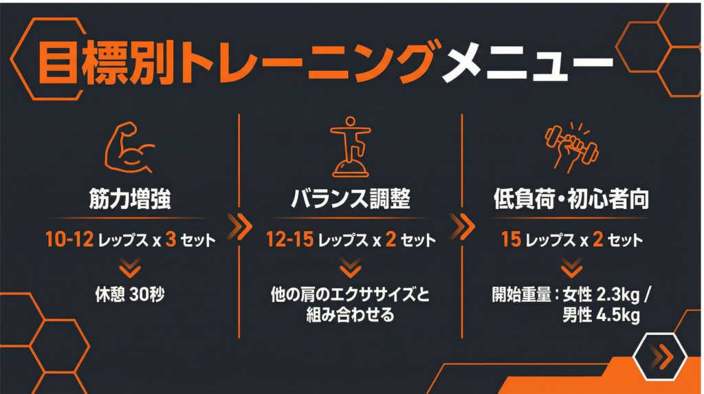 肩に大きな負荷をかけずに鍛えたい場合:15回前後 × 2セット