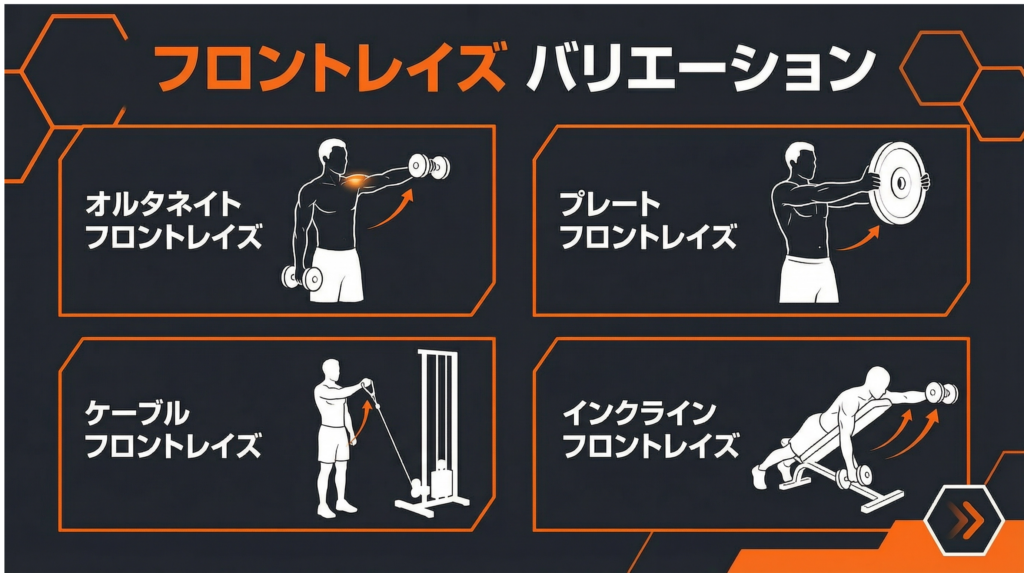 基本のフロントレイズに慣れてきたら、応用メニューにチャレンジしてみましょう。