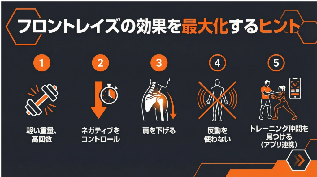 最後に、フロントレイズの効果を最大限に高めるためのコツをまとめます。