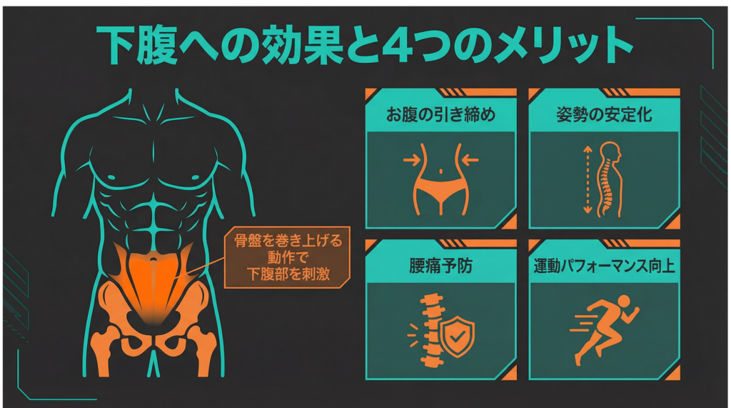 逆に、骨盤を後傾させることで腹直筋が強力に収縮し、下腹部への刺激が最大化されます。