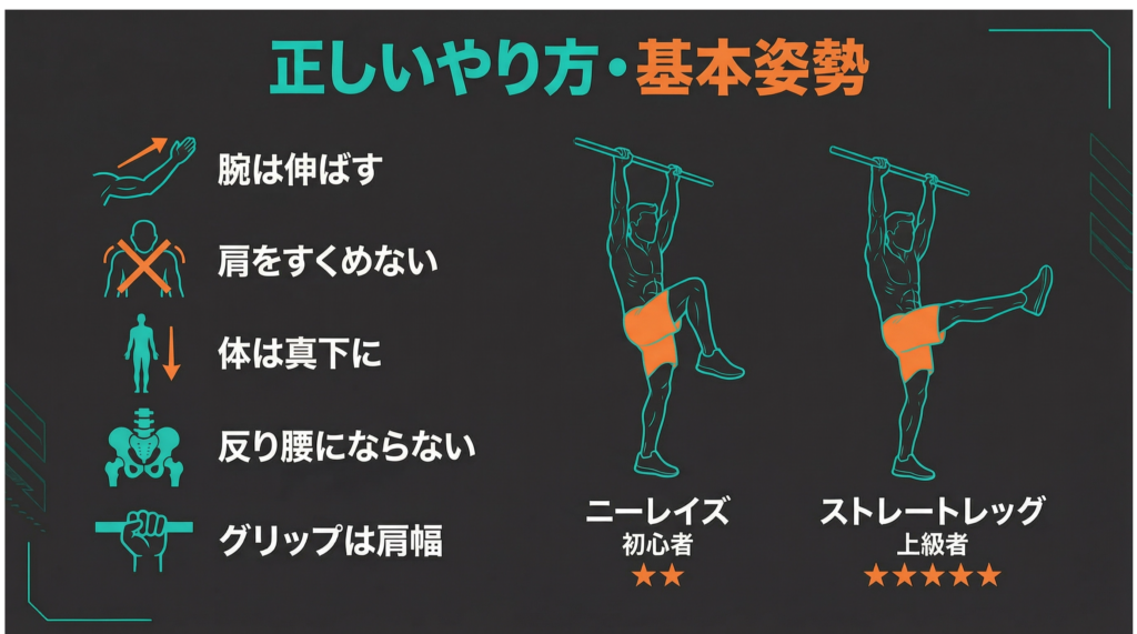 単に力を抜いてぶら下がる「デッドハング」ではなく、肩に力を入れて安定させることが重要です。