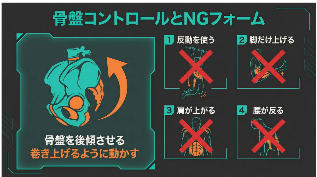 脚を単に持ち上げるだけでなく、骨盤を巻き上げるように動かすことで、下腹部への刺激が最大化されます。