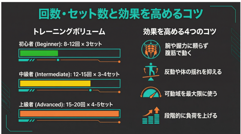 - トップで1〜2秒静止:最高到達点で静止することで、慣性を排除し腹筋に最大強度の負荷をかける