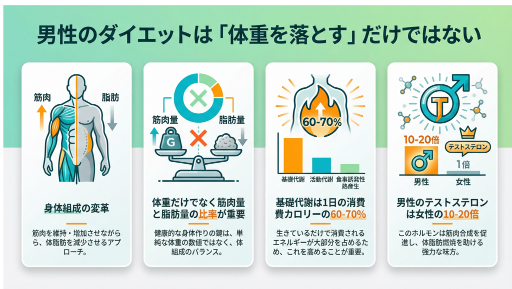 男性のダイエットは、単に体重を落とすことではなく、脂肪を減らしながら筋肉を維持する「身体組成の変革」を目指すもの。