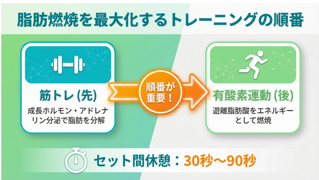 つまり、筋トレで脂肪を「分解」し、有酸素運動で「燃焼」するという二段階のプロセスが効率的な脂肪燃焼の鍵なのです。