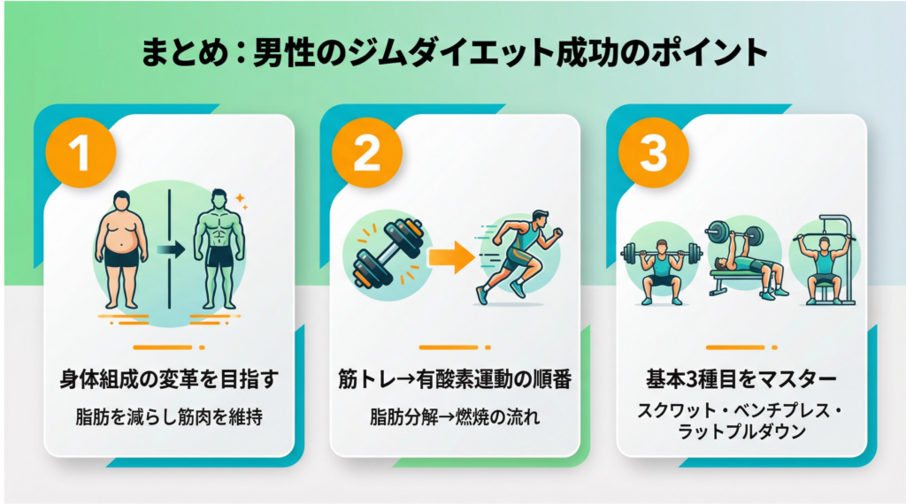 男性がジムでダイエットを成功させるポイントをおさらいしましょう。